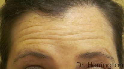This is a 43 year old female 3 weeks after treatment of Botox to her forehead, between eyebrows, and crow’s feet