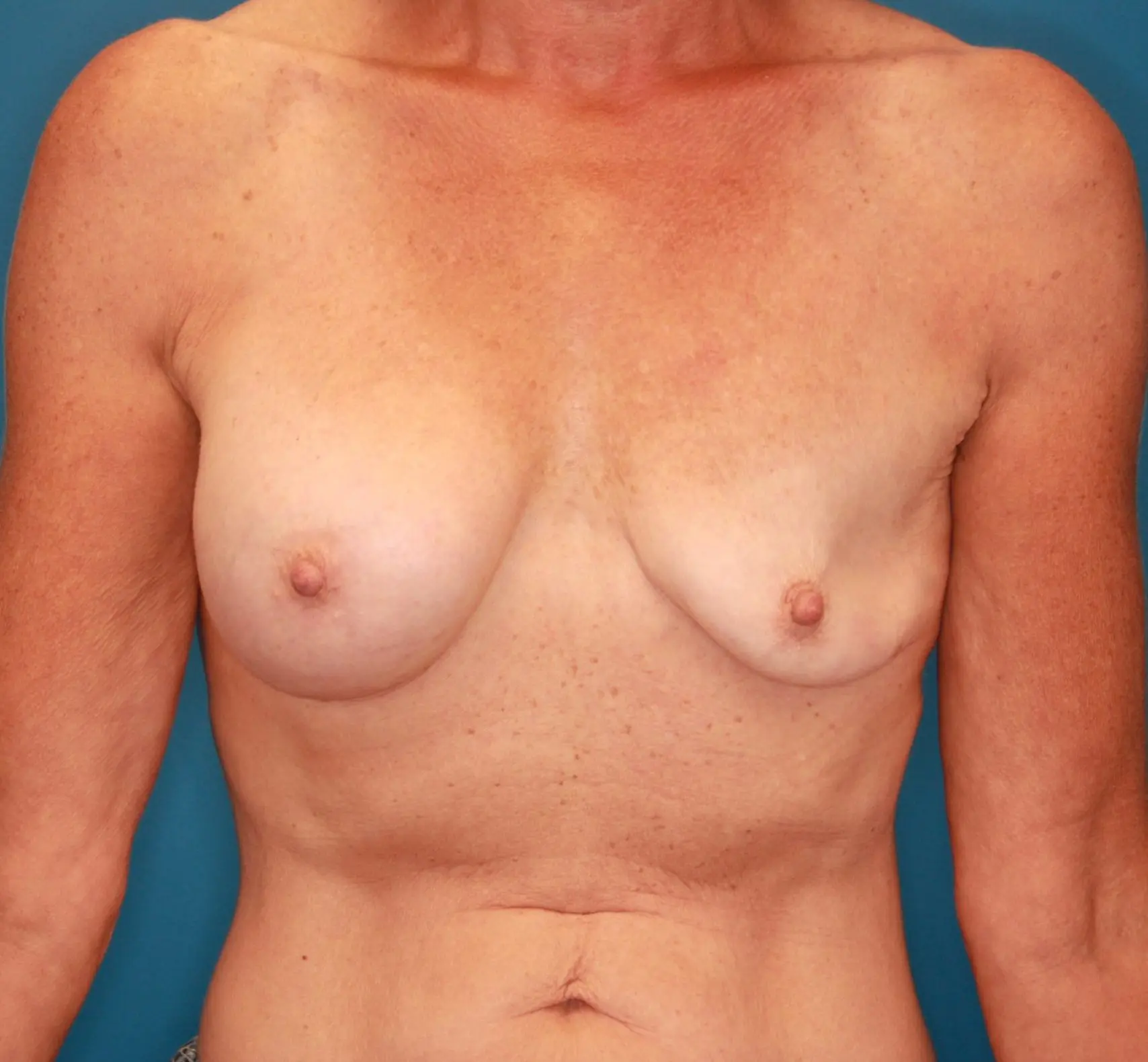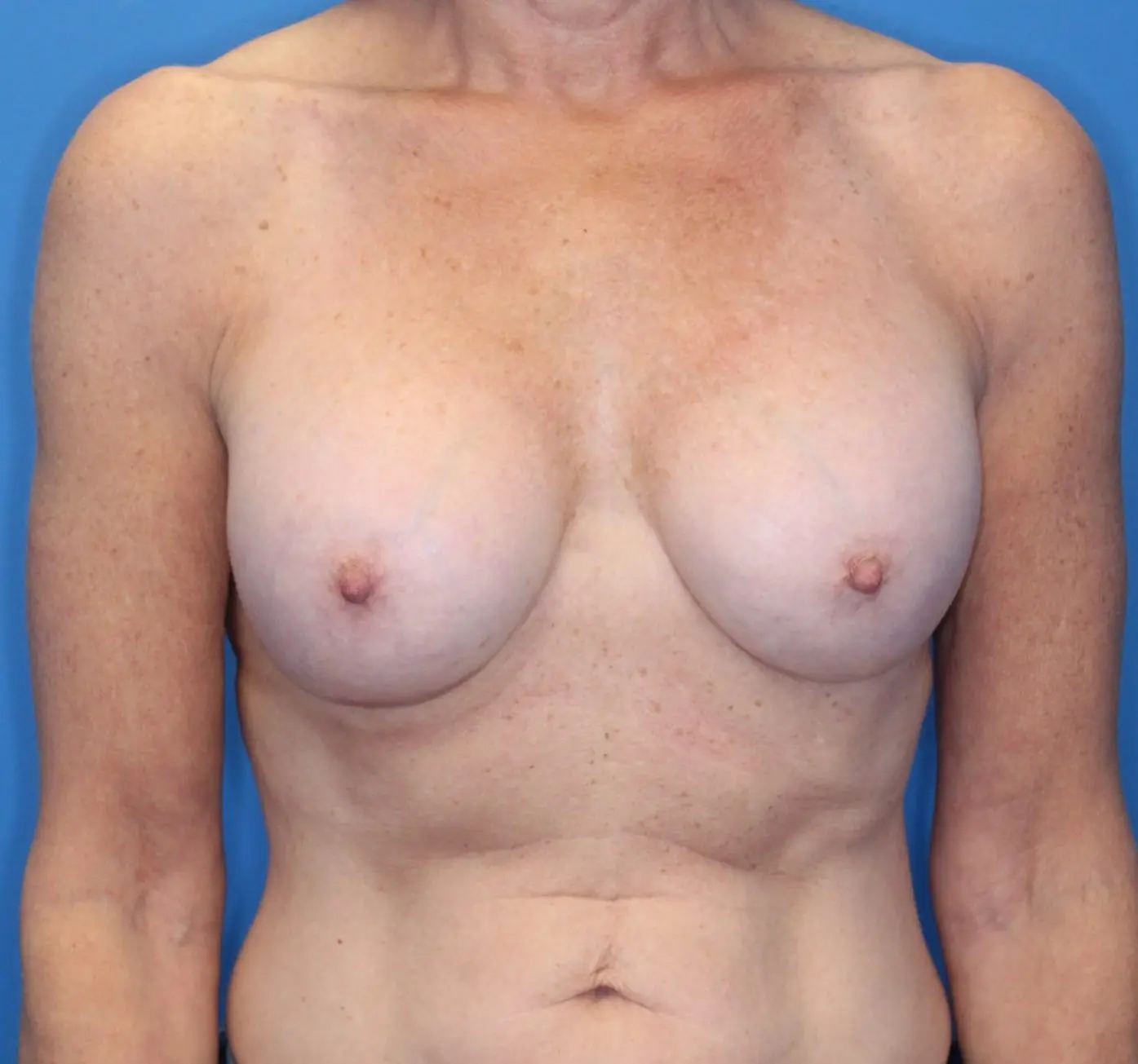 This female in her 50s had a ruptured left saline breast implant. She was seen by Dr. Jennifer Harrington and had a breast implant revision with removal of both saline implants and a replacement with Sientra moderate profile “gummy bear” gel implants, size 410 cc.